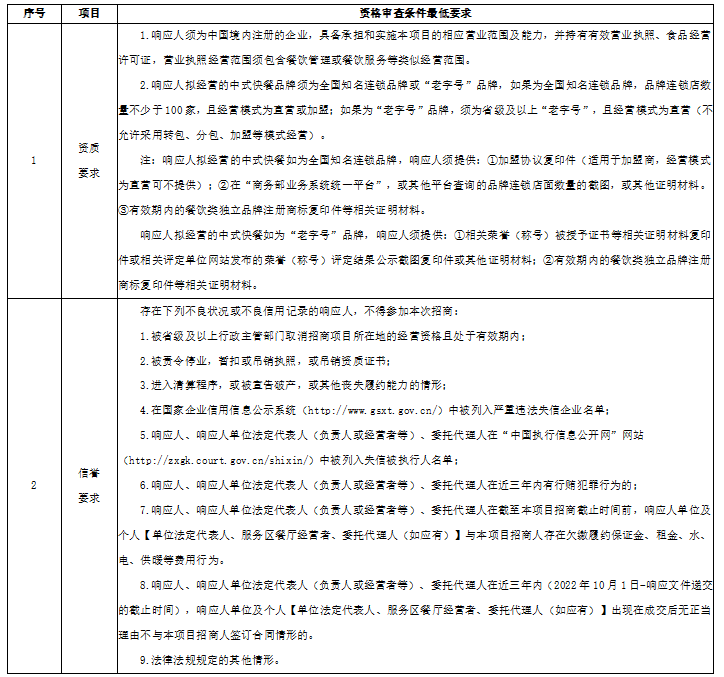 3.1本次招商要求響應人必須同時具備的資格要求詳見下表: