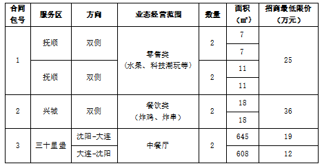 2.2招商范圍及合同包:本次招商業態為撫順服務區零售類檔口雙側4個點位,興城服務區餐飲類檔口雙側2個點位,三十里堡服務區中餐廳2個點位,共包含8個經營業態點位。本項目共劃分為三個合同包,響應人可以兼投兼中。